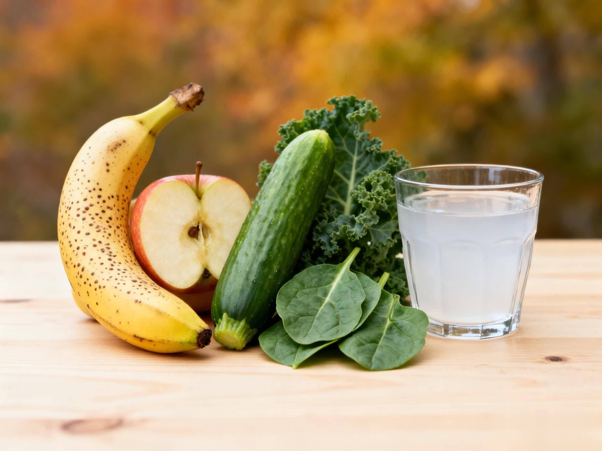 - 香蕉选熟透的(表皮带芝麻点),甜度高更润肠;苹果带皮切小块(果胶全在皮上!),提前用盐搓洗干净;水果黄瓜选嫩一点的,去掉蒂部硬芯;羽衣甘蓝甩干水分后,撕成巴掌大的片(叶片越薄越好打);