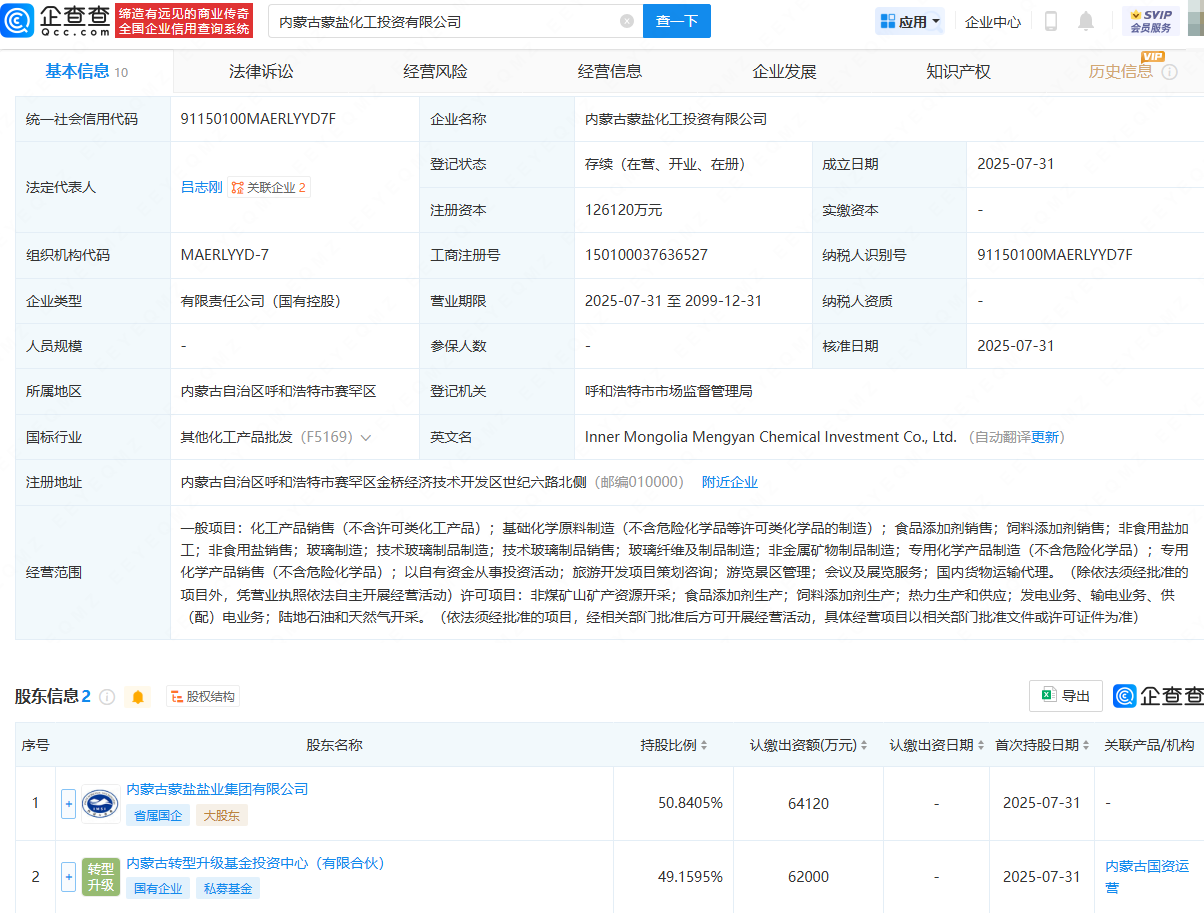 近日,内蒙古蒙盐化工投资有限公司成立,法定代表人为吕志刚,注册资本为12.61亿元,经营范围包含:食品添加剂销售;饲料添加剂销售;非食用盐加工;非食用盐销售;玻璃制造;非煤矿山矿产资源开采等。企查查股权穿透显示,该公司由内蒙古蒙盐盐业集团有限公司、内蒙古转型升级基金投资中心(有限合伙)共同持股。