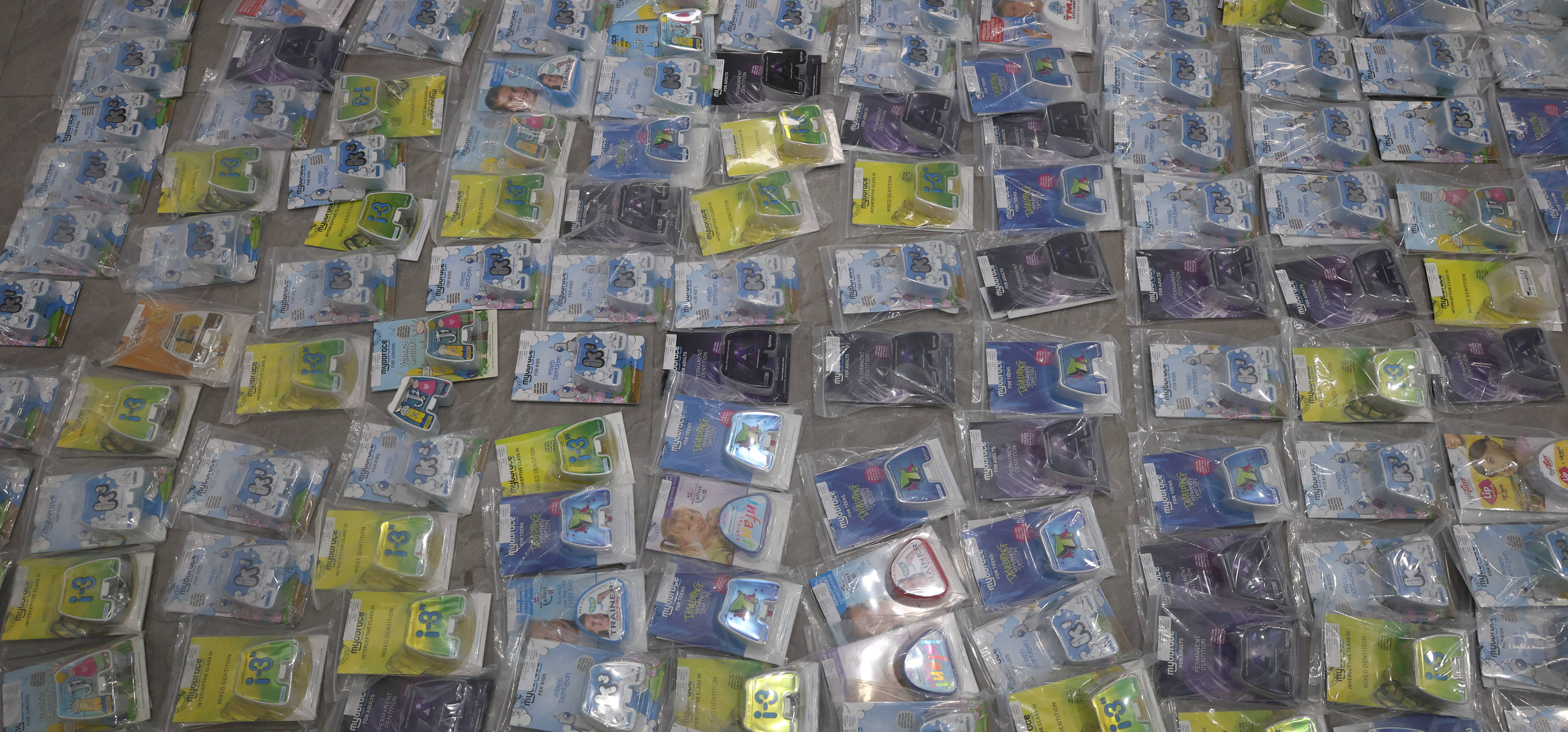 摆在记者面前的部分假冒牙齿矫治器产品,外包装看起来和正品毫无区别,但打开一闻,有明显的刺鼻塑料味。掂在手上观察,从材质光泽、分量和设计细节都有明显区别。