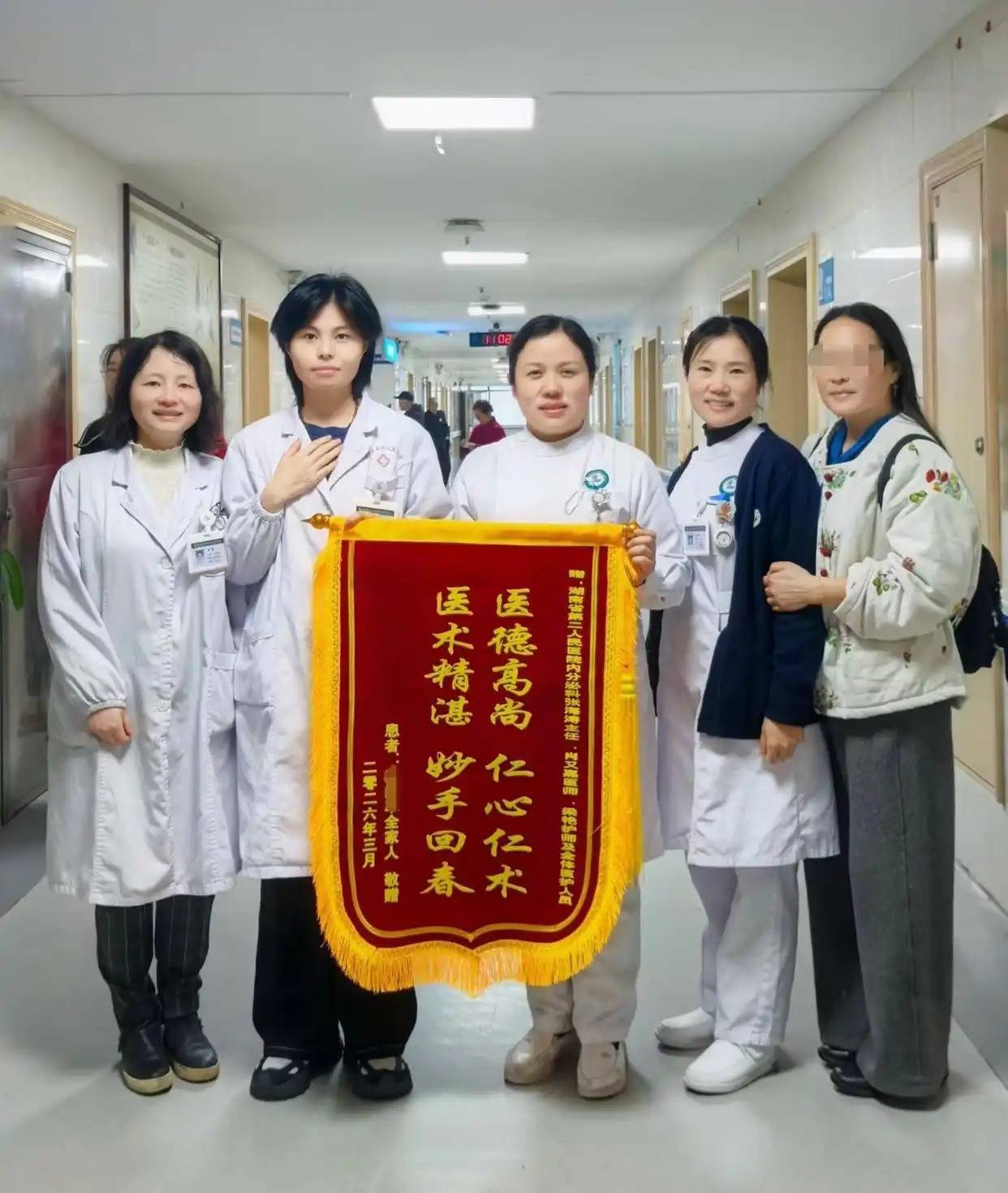出院前,黄奶奶特意叮嘱家属作为代表送来锦旗,用“医德高尚,仁心仁术;医术精湛,妙手回春”的真挚话语,表达对科室全体医护人员的感激之情。